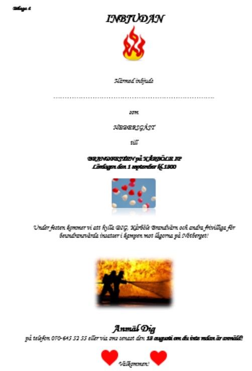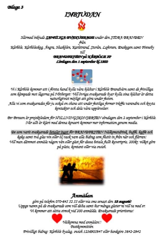 Tillsammans upprättade vi menyn: en välkomstdrink med tilltugg, en buffé bestående av pepparlax, rostbiff med potatissallad, grönsallad, bröd, vin eller alkoholfritt dito, öl eller alkoholfritt samt kaffe och Kårbölekaka. Stellan tog på sig ansvaret för att inköpa gåvor som skulle delas ut på festen – Kårbölering, fotografier samt brandkartor. Lillemor ansvarade för dukning, Birgitta såg till att inbjudan gick ut till de evakuerade byarna och att hedersinbjudan skickades till ”hjältarna”. Birgitta ansvarade också för att ta emot anmälningar via mobil eller sms. Majvor och Elin ansvarade för välkomstdrink och kaffe med kaka efter maten. Margareta stod för drickat samt höll koll på ekonomin.