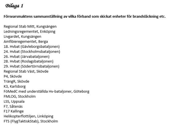 I släckningsarbetet av den stora Hälsingebranden bistod en rad brandkårer och militära förband och hemvärnsbataljoner (bilaga 1) samt ett antal utländska enheter. I bilaga 2 framgår den totala omfattningen av utländska insatser under brandförloppet. Här kan nämnas de sex brandbombplan som skickades från Italien, Portugal och Frankrike, specialutbildade brandmän från Frankrike och den stora konvojen från Polen, 44 brandbilar med 139 brandsoldater. Inalles brann ca 9000 hektar skog ner.