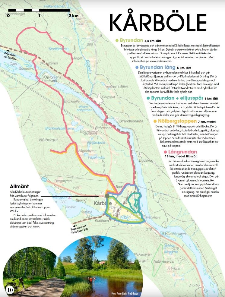 Läs mer på sidan ”Vandring och cykling” och i broschyren Vandra och cykla i Ljusdals kommun . På sidan 10, finns fem förslag på turer i Kårböle. De sträcker sig över 3,5 – 18 km och går både inne i byn på grusvägar eller gång- och cykelvägar, på stigar eller mer obanad terräng ute i skogen.